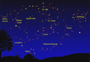 Über dem Orion hingegen stehen die Zwillinge und der Fuhrmann noch hoch am Himmel. Um Mitternacht haben sie dann aber den Frühlingssternbildern rund um den Löwen Platz gemacht. Zwischen den Zwillingen und dem Löwen fällt das Tierkreissternbild Krebs kaum auf. Bei klarem Himmel und fernab störender Lichter wird man mitten im Krebs einen Nebelfleck entdecken: den offenen Sternhaufen Praesepe, die Krippe. Steil über uns findet man jetzt den Großen Bären, dessen sieben hellste Sterne die bekannte Figur des Großen Wagens bilden.