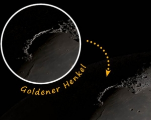 Der Astronomietag 2026 steht ganz im Zeichen unseres kosmischen Nachbarn: Der zunehmende Mond steht während der gesamten ersten Nachthälfte hoch am Himmel. Zehn Tage nach Neumond sind die Bedingungen ideal, um mit Ferngläsern und großen und kleinen Teleskopen seine Kraterlandschaften zu erkunden. Besonders auffällig zeigt sich unmittelbar an der Tag-und-Nacht-Grenze, die von der Sonne beleuchtete, bogenförmige Bergkette des Juragebirges, die die noch im Schatten liegende Regenbogenbucht einfasst: der sogenannte Goldene Henkel